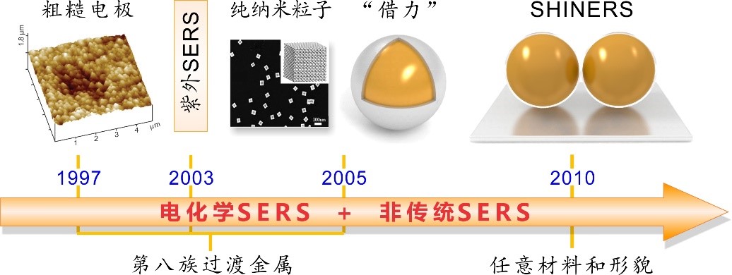 Surface-enhanced Raman spectroscopy (SERS) is a molecular vibrational spectroscopy with ultrahigh surface sensitivity benefited from the surface plasmon resonance (SPR) effect. However, its applications were significantly hindered by the prevailing opinion that the enormous SERS effect could only be generated on roughened gold, silver and copper surfaces. Since the 1990s, the research team systematically have concentrated on the development of the electrochemical (EC)-Raman and non-traditional SERS techniques, both experimentally and theoretically, which greatly expanded the applications of SERS. They achieved the following two world-leading results.