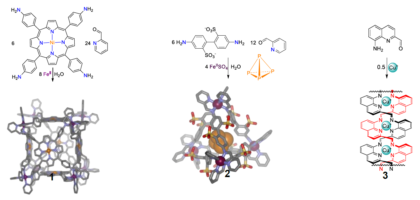 Fig. 1 FeII8 cubiccage 1,1 FeII4 tetrahedral cage 2,2 and electroluminescent CuIn double-helical polymer 33