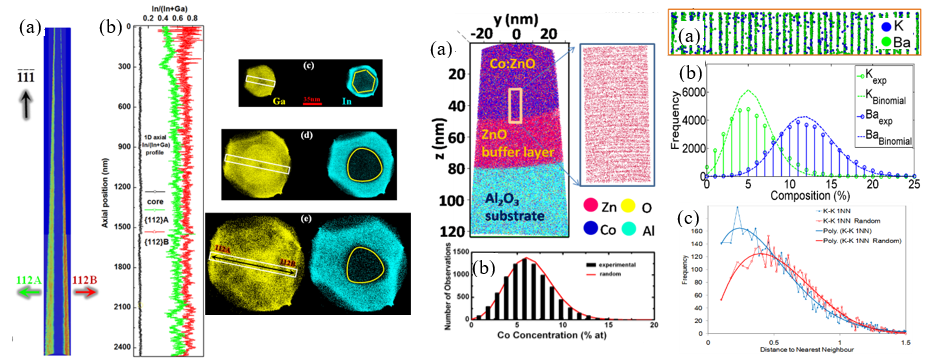 AtomProbe tomography have been applied to solve the critical questions insemiconductor [1, 2] and superconductor [3] materials. We havedemonstrated that, in the analysis of semiconductor nanowires epitaxially grownfrom a substrate, the presence of the flat substrate positioned onlymicrometers away from the analyzed tip apex alters the field distribution andion trajectories, which provides extra image compression that allows for theanalysis of the entire specimen. In InGaAs nanowires, we have revealed andexplained: (1) Ga-rich core and In-rich shell structure was grown via differentmechanisms; (2) the decomposition rate of the group III precursors determinesthe In/Ga ratio in the core; (3) The dimension of core increases from 45 to 65nm and the shape of the core changes from a hexagon to a rounded triangle fromthe top to the base of the nanowire; (4) The In/Ga ratio and inhomogeneousdistributions of group III atoms in the {112}. In order to unravel the magnetism of Co doped ZnOfilms, we have performed rigorous experiments on Co doped ZnO grown on α-Al2O3and O-polar ZnO (0001) substrates. In both cases, atom probe tomographyconfirms a random distribution of Co ion even at the interface region. In theZnO:Co on α-Al2O3 substrate, the interaction between high density of threadingdislocation, dopants, native point defects holds the key to understand thehitherto puzzling ferromagnetism observed in wide variety of doped and undopedsemiconductors. However, in the ZnO on the O-polar ZnO (0001) substrate,hydrogen plays a key role in mediating magnetic ordering. Local fluctuations inthe distribution of dopant atoms are thought to cause the nanoscale electronicdisorder or phase separation in pnictide superconductors. Atom probe tomographyhas enabled the first direct observations of dopant species clustering in aK-doped 122-phase pnictide. First-principles calculations suggest thecoexistence of static magnetism and superconductivity on a lattice parameterlength scale over a wide range of dopant concentrations. Our results provideevidence for a mixed scenario of phase coexistence and phase separation,depending on local dopant atom distributions.