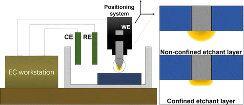 Nowadays, miniaturization and integration of functional components are becoming significant in ultralarge scale integration (ULSI) circuits, microelectromechanical systems (MEMS), and miniaturized total analysis systems (μ-TAS). As predicted by Moore’s law, the feature size of interconnectors in ULSI circuits are down to several nanometers. In this Account, we present our perseverant research in the last two decades on how to “confine” the ECM processes to occur at micrometer or even nanometer scale, that is, to ensure ECM with nanoscale accuracy. We have been developing the confined etchant layer technique (CELT) to fabricate three-dimensional micro- and nanostructures (3D-MNS) on different metals and semiconductor materials since 1992. In general, there are three procedures in CELT: (1) generating the etchant on the surface of the tool electrode by electrochemical or photoelectrochemical reactions; (2) confining the etchant in a depleted layer with a thickness of micro- or nanometer scale; (3) feeding the tool electrode to etch the workpiece. Scavengers, which can react with the etchant, are usually adopted to form a confined etchant layer. Through the subsequent homogeneous reaction between the scavenger and the photo- or electrogenerated etchant in the electrolyte solution, the diffusion distance of the etchant is confined to micro- or nanometer scale, which ensures the nanoscale accuracy of electrochemical machining.