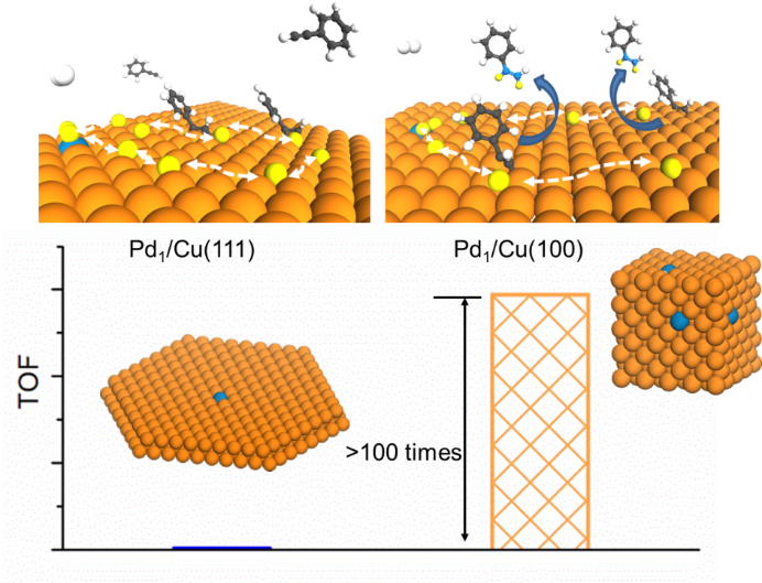 Abstract: Hydrogen spillover is a well-known phenomenon in heterogeneous catalysis; it involves H2 cleavage on an active metal followed by the migration of dissociated H species over an ‘inert’ support1,2,3,4,5. Although catalytic hydrogenation using the spilled H species, namely, spillover hydrogenation, has long been proposed, very limited knowledge has been obtained about what kind of support structure is required to achieve spillover hydrogenation1,5. By dispersing Pd atoms onto Cu nanomaterials with different exposed facets, Cu(111) and Cu(100), we demonstrate in this work that while the hydrogen spillover from Pd to Cu is facet independent, the spillover hydrogenation only occurs on Pd1/Cu(100), where the hydrogen atoms spilled from Pd are readily utilized for the semi-hydrogenation of alkynes. This work thus helps to create an effective method for fabricating cost-effective nanocatalysts with an extremely low Pd loading, at the level of 50 ppm, toward the semi-hydrogenation of a broad range of alkynes with extremely high activity and selectivity.