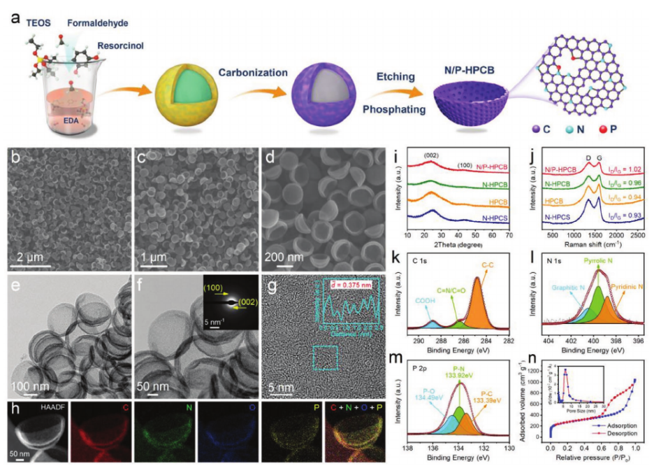 Abstract: Potassium‐ion batteries (PIBs) are promising alternatives to lithium‐ion batteries because of the advantage of abundant, low‐cost potassium resources. However, PIBs are facing a pivotal challenge to develop suitable electrode materials for efficient insertion/extraction of large‐radius potassium ions (K+). Here, a viable anode material composed of uniform, hollow porous bowl‐like hard carbon dual doped with nitrogen (N) and phosphorus (P) (denoted as N/P‐HPCB) is developed for high‐performance PIBs. With prominent merits in structure, the as‐fabricated N/P‐HPCB electrode manifests extraordinary potassium storage performance in terms of high reversible capacity (458.3 mAh g−1 after 100 cycles at 0.1 A g−1), superior rate performance (213.6 mAh g−1 at 4 A g−1), and long‐term cyclability (205.2 mAh g−1 after 1000 cycles at 2 A g−1). Density‐functional theory calculations reveal the merits of N/P dual doping in favor of facilitating the adsorption/diffusion of K+ and enhancing the electronic conductivity, guaranteeing improved capacity, and rate capability. Moreover, in situ transmission electron microscopy in conjunction with ex situ microscopy and Raman spectroscopy confirms the exceptional cycling stability originating from the excellent phase reversibility and robust structure integrity of N/P‐HPCB electrode during cycling. Overall, the findings shed light on the development of high‐performance, durable carbon anodes for advanced PIBs.