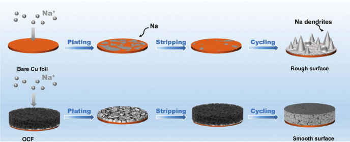 Abstract: Sodium metal anodes combine low redox potential (−2.71 V versus SHE) and high theoretical capacity (1165 mAh g−1), becoming a promising anode material for sodium‐ion batteries. Due to the infinite volume change, unstable SEI films, and Na dendrite growth, it is arduous to achieve a long lifespan. Herein, an oxygen‐doped carbon foam (OCF) derived from starch is reported. Heteroatom doping can significantly reduce the nucleation resistance of sodium metal; combined with its rich pore structure and large specific surface area, OCF provides abundant nucleation sites to effectively guide the nucleation and subsequent growth of sodium metal, and the nature of this foam can accommodate the deposited sodium. Furthermore, a more uniform, robust, and stable SEI layer is observed on the surface of OCF electrode, so it can maintain ultra‐high reversibility and excellent integrity for a long time without dendritic growth. As a result, when the current density is 10 mA cm−2, the electrode can maintain stable 2000 cycles and the coulombic efficiency can reach to 99.83%. Na@OCF||Na3V2(PO4)3 full cell also has extremely high capacity retention of about 97.53% over 150 cycles. These results provide a simple but effective method for achieving the safety and commercialization of sodium metal anode.