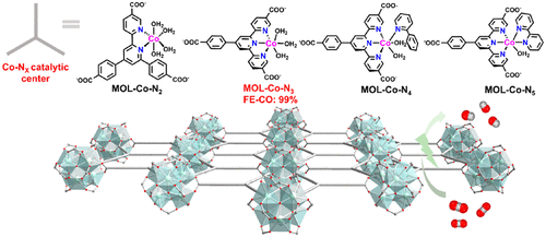 Abstract: The Co center is active in electrochemical CO2 reduction (CO2RR), and its activity can be tuned by changing its coordination environment. However, the coordination number around the Co center cannot be readily changed in homogeneous systems owing to bimolecular decomposition of reduced low-coordinate Co species. Herein we report the systematic tuning of N atom numbers from 2 to 5 in the first coordination sphere around Co centers supported on two-dimensional metal–organic layers (MOLs) for the electrochemical CO2RR. The N atoms come from a combination of bipyridine, terpyridine, and phenylpyridine ligands. The Co centers are isolated and stabilized on the MOL to prevent bimolecular decomposition. All of the catalysts, denoted MOL-Co-Nx (x = 2–5), are active in reducing CO2 to CO electrochemically, but their activities are highly dependent on the number of coordinating N atoms. MOL-Co-N3 showed the highest current density of 2.3 A mg–1 with a CO Faradaic efficiency of 99% at an overpotential of only 380 mV. Density functional theory calculations attribute the high activity of the Co-N3 center to a balance of ligand field strength and open coordination site: the high ligand field strength promotes back-bonding, while the open coordination site allows HCO3– assistance, both of which accelerate C–O cleavage. MOLs thus provide a unique platform to systematically study the relationship between the coordination environment and the reactivity of open metal sites in electrocatalysis.