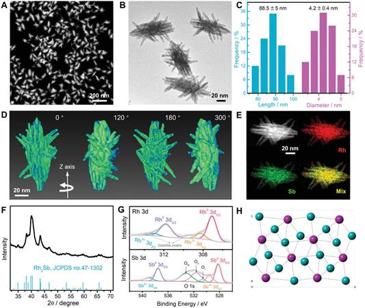 Abstract: Breaking the bottleneck of hydrogen oxidation/evolution reactions (HOR/HER) in alkaline media is of tremendous importance for the development of anion exchange membrane fuel cells/water electrolyzers. Atomically dispersed active sites are known to exhibit excellent activity and selectivity toward diverse catalytic reactions. Here, a class of unique Rh2Sb nanocrystals with multiple nanobranches (denoted as Rh2Sb NBs) and atomically dispersed Rh sites are reported as promising electrocatalysts for alkaline HOR/HER. Rh2Sb NBs/C exhibits superior HER performance with a low overpotential and a small Tafel slope, outperforming both Rh NBs/C and commercial Pt/C. Significantly, Rh2Sb NBs show outstanding HOR performance of which the HOR specific activity and mass activity are about 9.9 and 10.1 times to those of Rh NBs/C, and about 4.2 and 3.7 times to those of Pt/C, respectively. Strikingly, Rh2Sb NBs can also exhibit excellent CO tolerance during HOR, whose activity can be largely maintained even at 100 ppm CO impurity. Density functional theory calculations reveal that the unsaturated Rh sites on Rh2Sb NBs surface are crucial for the enhanced alkaline HER and HOR activities. This work provides a unique catalyst design for efficient hydrogen electrocatalysis, which is critical for the development of alkaline fuel cells and beyond.