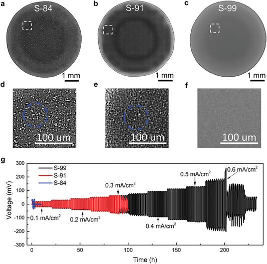 Abstract: The nucleation and growth of Li metal during deposition and the associated dendrite penetration are the critical and fundamental issues influencing the safety and power density of solid-state lithium metal batteries (SSLBs). However, investigations on Li metal deposition/dissolution especially the formation and growth of Li dendrites and their determining factors in the all-solid-state electrochemical systems are still lacking. In this work, in situ observations of the Li metal growth process, and defects induced heterogeneous deposition under cathodic load, are reported. By exploiting in situ scanning electron microscopy, along with electrochemical analytical approaches, the spatial distribution and morphological evolution of the deposited Li at the electrode|solid electrolyte interface are obtained and discussed. This investigation reveals that the formation of lithium whiskers is decided by the local Li ion flux and the deposition active sites, which are closely dependent on the content and types of defects in the polycrystalline electrolyte. Moreover, the defect regions exhibit faster Li deposition kinetics and higher nucleation tendency. These results can advance the fundamental understanding of the Li penetration mechanism in SSLBs.