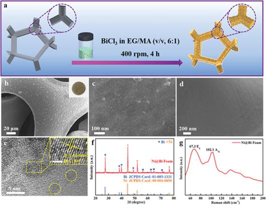 Abstract: As a favorable candidate for the next-generation anode materials, metallic lithium is faced with two crucial problems: uncontrollable lithium plating/stripping process and huge volume expansion during cycling. Herein, a 3D lithiophilic skeleton modified with nanoscale Bi sheets (Ni@Bi Foam, i.e., NBF) through one-step facile substitution reaction is constructed. Benefiting from the nanoscale modification, smooth and dense lithiophilic Li3Bi layer is in situ formed, which improves the uniform deposition of Li subsequently. Meanwhile, the 3D structure inhibits the growth of Li dendrites effectively by reducing local areal current density. Consequently, the NBF exhibits outstanding cycling stability with a high average Coulombic efficiency of 98.46% at 1 mA cm−2 with 1 mAh cm−2 (>500 cycles). Symmetrical cell with NBF exhibits a high reversibility at 1 mA cm−2 with 1 mAh cm−2 (>2000 h). Moreover, superior long-term cycling and rate performance of NBF@Li anode are also acquired when assembled with high areal loading of LiFePO4 (10.1 mg cm−2) cathode (Negative/Positive ratio: 2.91). Even in anode-free metal lithium batteries, NBF has higher capacity during cycling compared with NF. To conclude, NBF shows excellent electrochemical performance and provides an idea of facile preparation method which can be extend to other metal batteries.