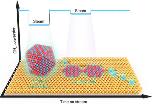 Abstract: The treatment of emissions from natural gas engines is an important area of research since methane is a potent greenhouse gas. The benchmark catalysts, based on Pd, still face challenges such as water poisoning and long-term stability. Here we report an approach for catalyst synthesis that relies on the trapping of metal single atoms on the support surface, in thermally stable form, to modify the nature of further deposited metal/metal oxide. By anchoring Pt ions on a catalyst support we can tailor the morphology of the deposited phase. In particular, two-dimensional (2D) rafts of PdOx are formed, resulting in higher reaction rates and improved water tolerance during methane oxidation. The results show that modifying the support by trapping single atoms could provide an important addition to the toolkit of catalyst designers for controlling the nucleation and growth of metal and metal oxide clusters in heterogeneous catalysts.
