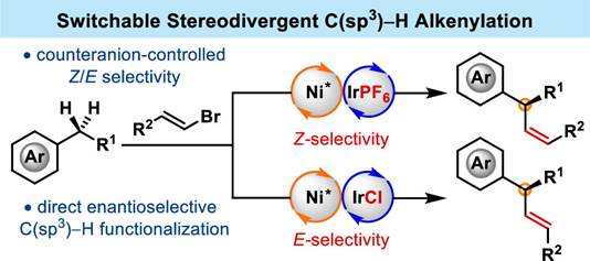 Abstract: The enantio- and stereoselective synthesis of stereodefined alkenes, especially the functionalized Z-isomer with an allylic stereogenic center, remains a great challenge. We herein report an enantioselective benzylic C(sp3)–H alkenylation of simple alkylarenes with vinyl bromides via photoinduced nickel catalysis, which allows for the stereodivergent synthesis of both enantioenriched Z- and E-alkenes bearing aryl-substituted, allylic tertiary stereogenic centers. Interestingly, the tunable Z/E-selectivity is achieved by energy transfer catalysis via a judicious choice of the photocatalyst counteranion. This versatile strategy features simple starting materials, mild reaction conditions, broad substrate scope, divergent Z- and E-selectivity, and high enantioselectivities. Moreover, a formal asymmetric benzylic C(sp3)–H alkylation can also be achieved via a one-pot alkenylation/reduction sequence, providing a complementary strategy to address the notoriously challenging stereochemical control in C(sp3)–C(sp3) bond construction.