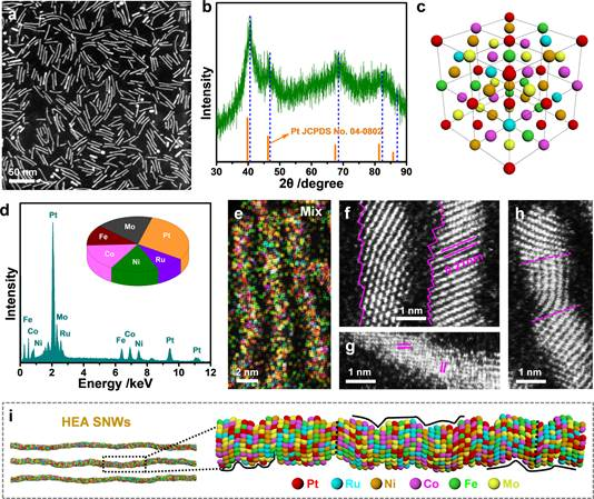 Abstract: High-entropy alloys (HEAs) with unique physicochemical properties have attracted tremendous attention in many fields, yet the precise control on dimension and morphology at atomic level remains formidable challenges. Herein, we synthesize unique PtRuNiCoFeMo HEA subnanometer nanowires (SNWs) for alkaline hydrogen oxidation reaction (HOR). The mass and specific activities of HEA SNWs/C reach 6.75 A mgPt+Ru−1 and 8.96 mA cm−2, respectively, which are 2.8/2.6, 4.1/2.4, and 19.8/18.7 times higher than those of HEA NPs/C, commercial PtRu/C and Pt/C, respectively. It can even display enhanced resistance to CO poisoning during HOR in the presence of 1000 ppm CO. Density functional theory calculations reveal that the strong interactions between different metal sites in HEA SNWs can greatly regulate the binding strength of proton and hydroxyl, and therefore enhances the HOR activity. This work not only provides a viable synthetic route for the fabrication of Pt-based HEA subnano/nano materials, but also promotes the fundamental researches on catalysis and beyond.
