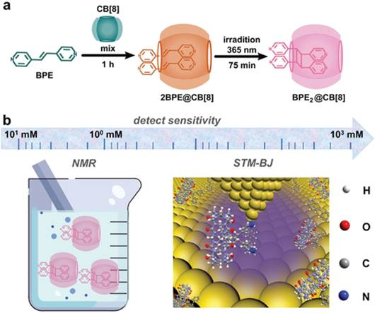Abstract: The host–guest interaction acts as an essential part of supramolecular chemistry, which can be applied in confined reaction. However, it is challenging to obtain the dynamic process during confined reactions below micromolar concentrations. In this work, a new method is provided to characterize the dimerization process of the guest 1,2-bis(4-pyridinyl) ethylene in host cucurbit[8]curil using scanning tunneling microscope-break junction (STM-BJ) technique. The guest reaction kinetics is quantitatively by nuclear magnetic resonance (NMR) and in situ single-molecule junctions. It is found that in the single-molecule conductance measurements, the electrical signals of the reactants with a concentration as low as 5 × 10−6 m are clearly detected, and the reaction kinetics at micromolar concentrations are further obtained. However, in NMR measurements, the characteristic peak signal of the reactants is undetectable when the concentration of the reactants is lower than 0.5 × 10−3 m and it cannot be quantified. In addition, the strong electric field from the nanogap accelerates the reaction. This work reveals that single-molecule STM-BJ techniques are more sensitive for tracking confined reactions than that by NMR techniques and can be used to study effect of extremely strong electric field on kinetics.
