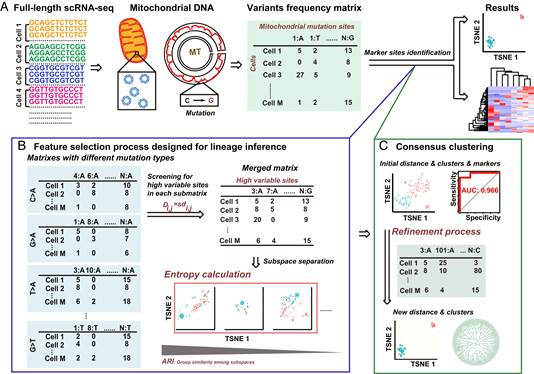Abstract: Single-cell RNA-sequencing (scRNA-seq) has become a powerful tool for biomedical research by providing a variety of valuable information with the advancement of computational tools. Lineage analysis based on scRNA-seq provides key insights into the fate of individual cells in various systems. However, such analysis is limited by several technical challenges. On top of the considerable computational expertise and resources, these analyses also require specific types of matching data such as exogenous barcode information or bulk assay for transposase-accessible chromatin with high throughput sequencing (ATAC-seq) data. To overcome these technical challenges, we developed a user-friendly computational algorithm called “LINEAGE” (label-free identification of endogenous informative single-cell mitochondrial RNA mutation for lineage analysis). Aiming to screen out endogenous markers of lineage located on mitochondrial reads from label-free scRNA-seq data to conduct lineage inference, LINEAGE integrates a marker selection strategy by feature subspace separation and de novo “low cross-entropy subspaces” identification. In this process, the mutation type and subspace–subspace “cross-entropy” of features were both taken into consideration. LINEAGE outperformed three other methods, which were designed for similar tasks as testified with two standard datasets in terms of biological accuracy and computational efficiency. Applied on a label-free scRNA-seq dataset of BRAF-mutated cancer cells, LINEAGE also revealed genes that contribute to BRAF inhibitor resistance. LINEAGE removes most of the technical hurdles of lineage analysis, which will remarkably accelerate the discovery of the important genes or cell-lineage clusters from scRNA-seq data.