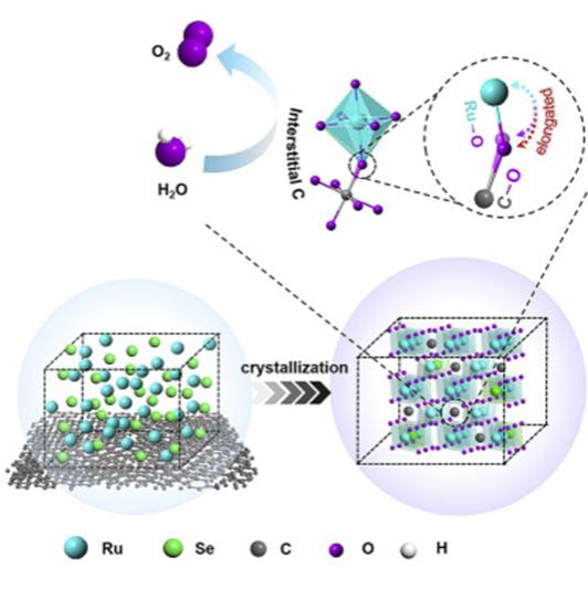 Abstract: Oxygen evolution reaction (OER) plays a critical role in energy conversion technologies. Significant progress has been made in alkaline conditions. In contrast, it remains a challenge to develop stable OER electrocatalysts in acidic conditions. Herein, we report a new strategy to stabilize RuO2 by introducing interstitial carbon (C-RuO2-RuSe), where the optimized C-RuO2-RuSe-5 exhibits a low overpotential of 212, 259, and 294 mV to reach a current density of 10, 50, and 100 mA cm−2, respectively. More importantly, C-RuO2-RuSe-10 has long-term stability of up to 50 h, representing one of the most stable OER electrocatalysts. X-ray absorption spectroscopy reveals that the Ru–O bonds have been elongated due to the formation of interstitial C. Theoretical calculations show that the elongated Ru–O bonds in RuO2 enhance its stability and reduce energy barriers for OER. This work provides a new perspective for designing and constructing efficient Ru-based electrocatalysts for water splitting.