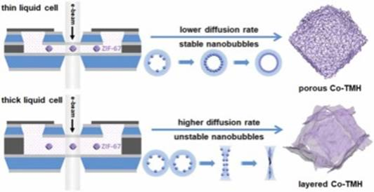 Abstract: Materials derived from MOFs have great potentials in energy conversion. However, the nanoscale transformation processes of MOFs derivatives remain unknown. Herein, by using in-situ liquid phase TEM, we directly visualize the MOFs etching processes. For the first time, unexpected nanobubble stability controlled transformation mechanism of ZIF-67 to porous or layered cobalt transition metal hydroxide (Co-TMH) is identified. Voids in MOFs migrate and merge to form nanobubbles due to structural collapse. Under slow diffusion conditions, nanobubbles move slowly and Co-TMH clusters generate on the nanobubble interface, further favoring the formation of internal nanocages and porous structures. On the other hand, a fast diffusion leads to rapid nanobubbles generation, aggregation and reshaping, inducing layered structure formation. Inspired by in-situ observation, we further synthesize porous Co-TMH at − 80 ℃ under inhibited diffusion conditions, which exhibits excellent catalytic performance on CO2 reduction reaction.