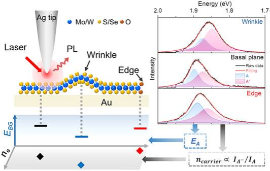 Abstract: Defects can locally tailor the electronic properties of 2D materials, including the band gap and electron density, and possess the merit for optical and electronic applications. However, it is still a great challenge to realize rational defect engineering, which requires quantitative study of the effect of defects on electronic properties under ambient conditions. In this work, we employed tip-enhanced photoluminescence (TEPL) spectroscopy to obtain the PL spectra of different defects (wrinkle and edge) in mechanically exfoliated thin-layer transition metal dichalcogenides (TMDCs) with nanometer spatial resolution. We quantitatively obtained the band gap and electron density at defects by analyzing the wavelength and intensity ratio of excitons and trions. We further visualized the strain distribution across a wrinkle and the edge-induced reconstructive regions of the band gap and electron density by TEPL line scans. The doping effect on the Fermi level and optical performance was unveiled through comparative studies of edges on TMDC monolayers of different doping types. These quantitative results are vital to guide defect engineering and design and fabrication of TMDC-based optoelectronics devices.