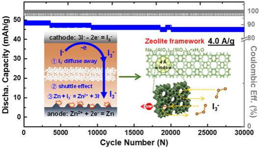 Abstract: Aqueous zinc iodide (Zn–I2) batteries are promising large-scale energy-storage devices. However, the uncontrollable diffuse away/shuttle of soluble I3– leads to energy loss (low Coulombic efficiency, CE), and poor reversibility (self-discharge). Herein, we employ an ordered framework window within a zeolite molecular sieve to restrain I3– crossover and prepare zeolite molecular sieve particles into compact, large-scale, and flexible membranes at the engineering level. The as-prepared membrane can confine I3– within the catholyte region and restrain its irreversible escape, which is proved via space-resolution and electrochemical in situ time-resolution Raman technologies. As a result, overcharge/self-discharge and Zn corrosion are effectively controlled by zeolite separator. After replacing the typically used glass fiber separator to a zeolite membrane, the CE of Zn–I2 battery improves from 78.9 to 98.6% at 0.2 A/g. Besides, after aging at the fully charged state for 5.0 h, self-discharge is restrained and CE is enhanced from 44.0 to 85.65%. Moreover, the Zn–I2 cell maintains 91.0% capacity over 30,000 cycles at 4.0 A/g.