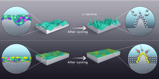 Abstract: The high-voltage battery has now become a goal in order to meet the demands for high-energy density. However, the severe side reactions between Li metal and carbonate-based electrolytes in this system result in unstable interphase, leading to non-uniform Li-ion flux and thus aggravating the dendrite growth of Li. The protect interphase, traditional solid electrolyte interface (SEI), is a loose solid layer consisted of many components, which generally does not possess the function of preventing the lithium budding. Herein, based on polysulfide solubility in ester, we proposed a strategy to eliminate the dendrite by constructing a unique SEI in which the dynamic polysulfides were in-situ formed and encapsuled. For this purpose, a 2-Fluorophenylsulfur Pentafluoride (2-FSPF) were employed as an additive in carbonate-based electrolyte that can be decomposed electrochemically during battery operation to form such a polysulfide-rich interphase. These polysulfides with certain fluidity can adhere dynamically the budding tip of Li metal, as a so-called tip-inhibitor, when the local current density of the tip rising, thus to hinder Li+ diffusion toward the tip, resulting in inhibiting the further growth of Li dendrites and leveling the Li deposition. At the current density of 1 mA cm−2,the average Coulombic efficiency of Li//Cu cells is as high as 98.39% during 600 cycles, and the stable cycling of Li//Li symmetric cell reaches 3500 h. Furthermore, due to the high anodic stability, the Li//high-voltage LiCoO2 (LCO) full cells and Li−O2 battery achieve excellent cycle performance with lean electrolyte.