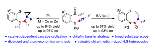 Abstract: Medium-sized N,S-heterocycles have received tremendous interest due to their biological activities and potential medical applications. However, asymmetric synthesis of these compounds are extremely rare. Described herein is a catalyst-dependent [3,3]-sigmatropic rearrangement of sulfoxide-ynamides, enabling divergent and atom-economic synthesis of a series of valuable medium-sized N,S-heterocycles in moderate to good yields with broad substrate scope. Importantly, excellent enantioselectivities have been achieved via an unprecedented chirality-transfer. Moreover, theoretical calculations are employed to elucidate the origins of the catalyst-dependent stereospecific [3,3]-rearrangement.