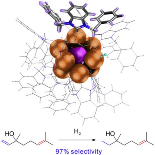 Abstract: A catalyst containing atomically dispersed Pd sites on N-heterocyclic carbene (NHC)-stabilized Au nanoclusters, with the precise formula of PdAu9(NHCBn)7X2 (NHCBn is dibenzylbenzimidazolin-2-ylidene, X is Br or Cl), has been developed for the regioselective hydrogenation of alkenes. Each Pd site is encircled by an Au9 ring protected by seven NHC and two halide ligands. Such an encirclement arrangement and open stereochemical framework endow the single Pd atom with the power to activate molecular hydrogen and catalyze the hydrogenation of alkenes efficiently. Interestingly, it otherwise exhibits much lower activity toward the crowded alkenes, owing to the inherent and highly stringent steric requirement of NHC ligands, as also visualized by the theory. As such, these clusters are demonstrated to be a highly efficient (653 h−1 of turnover frequency) and highly selective (97%) catalyst in the regioselective hydrogenation of linalool, an important synthetic perfume and a key intermediate in the synthesis of vitamin A.