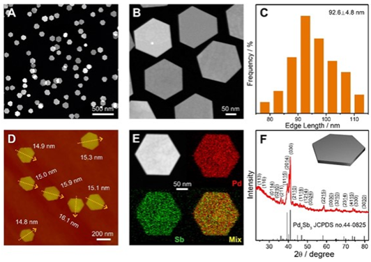 Abstract: Developing high-performance electrocatalysts for both ethanol oxidation reaction (EOR) and oxygen reduction reaction (ORR) is essential for the commercialization of direct ethanol fuel cells (DEFCs), but it is still formidable challenging. Herein, for the first time we have successfully prepared a novel Pd-Sb hexagonal nanoplate for boosting both cathodic and anodic fuel cell reactions. Detailed structural characterizations reveal that the nanoplates have ordered rhombohedral phase of Pd8Sb3 (denoted as Pd8Sb3 HPs) with Pd-terminated surface. Significantly, the unique Pd8Sb3 HPs can exhibit much enhanced activity towards the oxidation of various alcohols in alkaline media. In particular, Pd8Sb3 HPs/C displays superior specific and mass activities of 29.3 mA cm–2 and 4.5 A mgPd–1 towards EOR, which are 7.0 and 11.3 times higher than those of commercial Pd/C, and 9.8 and 3.8 times higher than those of commercial Pt/C, respectively, representing one of the best EOR catalysts reported to date. In-situ electrochemical ATR-SEIRAS measurements reveal that Pd8Sb3 HPs/C can effectively promote the C2 pathway of EOR, which is the key to the improved activity. As further disclosed by the density functional theory calculations, the higher EOR intrinsic catalytic activity of Pd8Sb3 HPs can be ascribed to the reduced energy barrier of ethanol dehydrogenation. In addition, Pd8Sb3 HPs/C can also show superior performance to both commercial Pd/C and Pt/C in cathodic ORR. This work advances the controllable synthesis of Pd-Sb nanostructure, which give huge impetus to the design of high-efficiency bifunctional electrocatalysts for energy conversion and beyond.