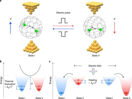 Abstract: In-memory computing provides an opportunity to meet the growing demands of large data-driven applications such as machine learning, by colocating logic operations and data storage. Despite being regarded as the ultimate solution for high-density integration and low-power manipulation, the use of spin or electric dipole at the single-molecule level to realize in-memory logic functions has yet to be realized at room temperature, due to their random orientation. Here, we demonstrate logic-in-memory operations, based on single electric dipole flipping in a two-terminal single-metallofullerene (Sc2C2@Cs(hept)-C88) device at room temperature. By applying a low voltage of ±0.8 V to the single-metallofullerene junction, we found that the digital information recorded among the different dipole states could be reversibly encoded in situ and stored. As a consequence, 14 types of Boolean logic operation were shown from a single-metallofullerene device. Density functional theory calculations reveal that the non-volatile memory behaviour comes from dipole reorientation of the [Sc2C2] group in the fullerene cage. This proof-of-concept represents a major step towards room-temperature electrically manipulated, low-power, two-terminal in-memory logic devices and a direction for in-memory computing using nanoelectronic devices.