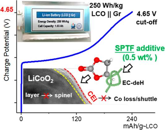 Abstract: Extending the charge cutoff voltage of cathode (e.g., LiCoO2) is a promising way to increase the energy density of Li-ion batteries, but critical challenges lie in the threats triggered by structural distortion and an unstable electrode/electrolyte interface. The general approach to enhance the stability of the cathode/electrolyte interface (CEI) consists of replacing the decomposition or sacrificing sources of carbonate solvents (e.g., EC) with concentrated or fluorinated electrolyte strategies. Herein, without following typical replacement strategies, we introduce a trace electrolyte additive and refine the dehydrogenation process of the original carbonate solvents, resulting in an enhanced CEI and long-term cycling stability of LiCoO2 up to 4.65 V. We demonstrate that cathode structure distortion, LiPF6 hydrolysis, and Co dissolution and shuttling have been simultaneously restrained. With the achievement of a long-life 250 and 270 Wh/kg pouch cells (assembled with a commercial graphite and SiO anodes), the refinement of the “old-school” electrolyte additive strategy opens up avenues toward the design of practical high-voltage full-cell systems.