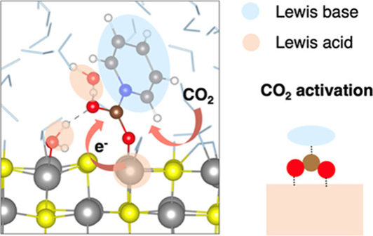 Abstract: Photoelectrochemical CO2 reduction has attracted considerable attention as a route to convert CO2 into value-added products. Pyridine (Py)-catalyzed CO2 reduction on a GaP photoelectrode has been shown to be a promising photoelectrochemical system to produce methanol under the underpotential condition. However, whether the dramatic decrease in overpotential can be attributed to the CO2 activation by the formation of the zwitterionic complex PyCO2 is currently under debate. Because the alignment between the band edge positions of photoelectrodes and the redox potentials of species determines the desired redox reactions, calculations have been performed to evaluate the band edge positions of GaP and the redox potentials of relevant reactions. In these works, the water effect has been either neglected or approximated by using the dielectric continuum or a few explicit water molecules, which may not be enough to determine the accurate energy level alignment in realistic chemical environments. Moreover, calculations performed in conventional implicit solvation models suggested that PyCO2 is unstable in homogeneous aqueous, while the bonding interactions between CO2 and N species have been experimentally detected. Thus, we performed ab initio molecular dynamics to investigate the band alignment of GaP, as well as the stability and the reducibility of PyCO2 in more realistic chemical environments. Our results showed that the solvation effect and the pyridine adsorption could shift up the band edge positions of GaP significantly, and neglecting such effects could result in a serious underestimation of the activity of the photocatalysts. More importantly, we found that the interaction between pyridine and CO2 at the GaP(110)/water interface is strong due to the synergetic stabilization effect, which leads to an about 0.6 V less negative redox potential of PyCO2/PyCO2– than that of CO2/CO2– in the homogeneous aqueous. Furthermore, we compared the redox potential of PyCO2/PyCO2– at the GaP(110)/water interface with the conduction band minimum of GaP, which showed that the reduction of the adsorbed PyCO2 is thermodynamically feasible. Our results suggested that the CO2 activation by the formation of PyCO2 at the GaP(110)/water interface could be responsible for the low overpotential. This work provides valuable insights into the mechanism of pyridine-catalyzed CO2 reduction on GaP and could pave the way for the development of efficient catalysts for CO2 reduction.