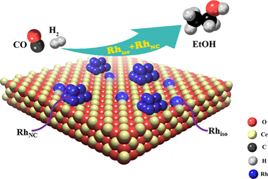 Abstract: Metal single-atom catalysts (SACs) have attracted extensive interest because of their maximum atom efficiency and potentially good performances. However, the understanding of the catalytic behavior and the stability of SACs in high-temperature catalytic reactions remains a major challenge, especially under reducing conditions. In this work, we investigated the nature and stability of Rh/CeO2 SACs with different Rh loadings (0.2–4 wt % Rh) during syngas conversion (260 °C, 2 MPa). Using CO-DRIFTS, we found that atomically dispersed Rh was dispersed on Rh/CeO2 catalysts with an Rh loading up to 3 wt %. The Rh/CeO2 catalysts were stable in H2 up to 350 °C, while Rh nanoclusters were formed in CO at 200 °C. During syngas conversion at 260 °C, the Rh single atoms (Rhiso) on a 0.5 wt % Rh/CeO2 SAC slowly agglomerated to form Rh nanoclusters (RhNC) and a Rhiso/RhNC ratio of ∼1:2.5 was obtained after ∼10 h time-on-stream run. Furthermore, the Rhiso/RhNC ratio did not change with further reaction, indicating that the reaction reached steady state after a 10 h run. After the catalysts reached steady state (∼10 h), the Rhiso/RhNC ratio on the spent Rh/CeO2 catalysts decreased with the increase in Rh loadings, while the reactivity increased first and then decreased. We observed an optimal value of Rhiso/RhNC ≈ 1:3 on the 1 wt % Rh/CeO2 catalyst, showing the maximum reaction rates of CO (rCO) and ethanol selectivity (SEtOH) of 85.8 μmol/s/gRh and 26.2%, respectively. This indicated that the combination of Rh single atoms and Rh nanoclusters is beneficial to the ethanol selectivity and reaction rate, which was confirmed by DFT simulations. Moreover, the ratios of Rhiso/RhNC on the spent catalysts under the steady state have good relationships with the CO conversion rate and product selectivity in the reaction.