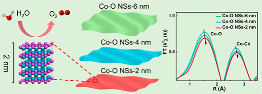 Abstract: Thickness regulation of transition metal hydroxides/oxides nanosheets with superior catalytic properties represents a promising strategy to enhance catalytic performance, but it remains an enormous challenge to achieve precise control, especially when it comes to the ultrathin limit (several atomic layers). In this work, a facile strategy of alkylamine-confined growth is proposed for the synthesis of thickness-tunable metal hydroxide/oxide nanosheets. Specifically, ultrathin cobalt hydroxide and cobaltous oxide hybrid (Co(OH)2-CoO) nanosheets (Co–O NSs) with a thickness in the range of 2–6 nm (5–13 atomic layers) are synthesized by using alkylamines with different carbon chain lengths as the ligand to modulate vertical coordination ability. Co–O NSs with a thickness of 2 nm (Co–O NSs-2 nm) exhibit excellent oxygen evolution reaction (OER) performance with an overpotential of 278 mV at 10 mA/cm2. The maximized number of active sites including oxygen vacancies, optimal adsorption strength, and the highest electrical conductivity are considered as the potential factors contributing to the excellent OER performance of Co–O NSs-2 nm. This work holds great significance for the precise thickness-tunable synthesis of transition metal layered hydroxide nanosheets with modulated and improved catalytic performance.