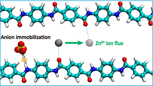 Abstract: The Zn dendrite issue, which is closely related to the creation of the space-charge region upon local anion depletion during cycling, has plagued the practical applications of aqueous Zn metal batteries (ZMBs). Herein, we propose a Kevlar-derived hydrogel (KevlarH) electrolyte with immobilized anions to diminish the space-charge layer effect. SO42– anions are strongly tethered to amide groups of polymer chains, which mitigates the concentration polarization of interfacial Zn2+ ions by preventing the anion depletion. Furthermore, the relatively weak interaction between Zn2+ cations and carbonyl groups can redistribute Zn2+-ion flux without sacrificing the ion diffusion rate. The synergistic “zincophilic” and “anionphilic” building blocks enable dendrite-free Zn deposition behavior and suppressed side reactions, thereby extending the lifespan of a Zn metal anode up to 3500 h with an ultrahigh Coulombic efficiency of 99.87%. Importantly, the KevlarH electrolyte can be directly used to assemble high-voltage bipolar ZMBs and break the 2 V barrier in aqueous ZMBs.