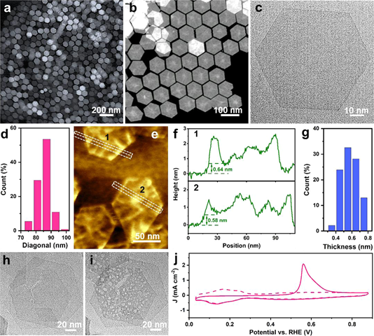 Abstract: Metastable phase two-dimensional catalysts provide great flexibility for modifying their chemical, physical, and electronic properties. However, the synthesis of ultrathin metastable phase two-dimensional metallic nanomaterials is highly challenging, mainly due to the anisotropic nature of metallic materials and their thermodynamically unstable ground-state. Here, we report free-standing RhMo nanosheets with atomic thickness and a unique core/shell (metastable phase/stable phase) structure. The polymorphic interface between the core region and shell region stabilizes and activates metastable phase catalysts; the RhMo Nanosheets/C shows excellent hydrogen oxidation activity and stability. Specifically, the mass activities of RhMo Nanosheets/C is 6.96 A mgRh−1; this is 21.09 times higher than that of commercial Pt/C (0.33 A mgPt−1). Density functional theory calculations suggest that the interface aids in the dissociation of H2 and the H species can then spillover to weak H binding sites for desorption, providing excellent hydrogen oxidation activity for RhMo nanosheets. This work advances the highly controlled synthesis of two-dimensional metastable phase noble metals and provides great directions for the design of high-performance catalysts for fuel cells and beyond.