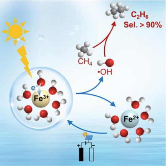 Abstract: Photo-driven CH4 conversion to multi-carbon products and H2 is attractive but challenging, and the development of efficient catalytic systems is critical. Herein, we construct a solar energy-driven iron ions redox cycle for combining CH4 conversion and H2 production. A photo-driven iron-induced reaction system is developed, which is efficient at selective coupling of CH4 as well as conversion of benzene and cyclohexane under mild conditions. For CH4 conversion, 94% of C2 selectivity and 8.4 μmol h−1of C2H6 formation rate is achieved. Mechanism studies reveal that CH4 coupling is induced by hydroxyl radical, which is generated by photo-driven intermolecular charge migration of Fe3+ complex. The delicate coordination structure of [Fe(H2O)5OH]2+ complex ensures the selective C−H bond activation and C−C coupling of CH4. The produced Fe2+ can be used to reduce the potential for electrolytic H2 production, and then turns back into Fe3+, forming an energy-saving and sustainable recycle system.