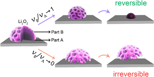 Abstract: In the pursuit of a highly reversible lithium–oxygen (Li–O2) battery, control of reaction sites to maintain stable conversion between O2 and Li2O2 at the cathode side is imperatively desirable. However, the mechanism involving the reaction site during charging remains elusive, which, in turn, imposes challenges in recognition of the origin of overpotential. Herein, via combined investigations by in situ atomic force microscopy (AFM) and electrochemical impedance spectroscopy (EIS), we propose a universal morphology-dictated mechanism of efficient reaction sites for Li2O2 decomposition. It is found that Li2O2 deposits with different morphologies share similar localized conductivities, much higher than that reported for bulk Li2O2, enabling the reaction site not only at the electrode/Li2O2/electrolyte interface but also at the Li2O2/electrolyte interface. However, while the mass transport process is more enhanced at the former, the charge-transfer resistance at the latter is sensitively related to the surface structure and thus the reactivity of the Li2O2 deposit. Consequently, for compact disk-like deposits, the electrode/Li2O2/electrolyte interface serves as the dominant decomposition site, which causes premature departure of Li2O2 and loss of reversibility; on the contrary, for porous flower-like and film-like Li2O2 deposits bearing a larger surface area and richer surface-active structures, both the interfaces are efficient for decomposition without premature departure of the deposit so that the overpotential arises primarily from the sluggish oxidation kinetics and the decomposition is more reversible. The present work provides instructive insights into the understanding of the mechanism of reaction sites during the charge process, which offers guidance for the design of reversible Li–O2 batteries.