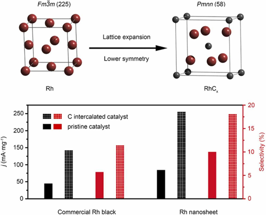Abstract: Selective breaking of the C-C bond in ethanol holds the key to many industrial processes, including the operation of direct ethanol fuel cells and steam reforming. Interstitial C atoms in the subsurface region of noble-metal catalysts have major impacts on the selectivity and activity, but an understanding of the mechanistic details is still elusive due to their nature of in situ formation and metastability. Herein, we develop a method to obtain stable RhCx (x≈0.5) by introducing C atoms into the interstitial sites of well-defined Rh nanosheets of 8-10 atomic layers in thickness, and further elucidate the electronic and geometric effects of the interstitial C atoms on the cleavage of C-C bond. With the introduction of C atoms into half of the octahedral sites, the Rh lattice changes from a cubic to an orthorhombic structure. The lattice expansion induced by the insertion of C atoms, together with the electron transfer between C and Rh atoms, effectively suppresses the coupling reaction between OH* and CH3CO* to form acetic acid while making the cleavage of C-C bond more exothermic. As such, we obtain a selectivity of ethanol to CO2 as high as 18.1%, much higher than those of the Rh counterpart (10.0%), together with 3.1-fold improvement in kinetics. Guided by these findings, a new method is also developed to directly introduce C atoms into the subsurface of a commercial Rh black to enhance its selectivity and activity by 2.5- and 1.6- folds, respectively.