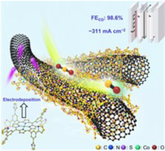Abstract: Electrocatalytic CO2 reduction reaction (CO2RR) based on molecular catalysts, e.g., cobalt porphyrin, is a promising approach to enhance carbon cycle and mitigate climate crisis. However, the electrocatalytic performance and accurate evaluations remains problems because of either the low loading amount or the low utilization rate of the electroactive CoN4 sites. W e herein synthesized a monomer, cobalt(II)-5,10,15,20-tetrakis(3,5-di(thiophen-2-yl)phenyl)porphyrin (CoP), electropolymerized it onto the crosslinked carbon nanotubes (CNTs) networks, affording a molecular electrocatalyst of three-dimensional (3D) microporous nanofilm (EP-CoP, 2∼3 nm thickness) with highly dispersed CoN4 sites. The new electrocatalyst shortens the electron transfer pathway, accelerates the redox kinetics of CoN4 sites and improves the durability in the electrocatalytic CO2RR. From the intrinsic redox behavior of CoN4 sites, the effective utilization rate is obtained as 13.1%, much higher than that of the monomer assembled electrode (5.8%), and the durability is also promoted dramatically (> 40 h) in a H-type cell. In a commercial flow cell, EP-CoP can achieve a faradic efficiency for CO (FECO) over 92% at an overpotential of 160 mV. At a higher overpotential of 620 mV, the working current density can reach 310 mA cm−2 with a high FECO of 98.6%, representing the best performance for electrodeposited molecular porphyrin electrocatalysts.