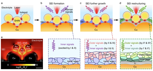Abstract: The solid-electrolyte interphase (SEI) plays crucial roles for the reversible operation of lithium metal batteries. However, fundamental understanding of the mechanisms of SEI formation and evolution is still limited. Herein, we develop a depth-sensitive plasmon-enhanced Raman spectroscopy (DS-PERS) method to enable in-situ and nondestructive characterization of the nanostructure and chemistry of SEI, based on synergistic enhancements of localized surface plasmons from nanostructured Cu, shell-isolated Au nanoparticles and Li deposits at different depths. We monitor the sequential formation of SEI in both ether-based and carbonate-based dual-salt electrolytes on a Cu current collector and then on freshly deposited Li, with dramatic chemical reconstruction. The molecular-level insights from the DS-PERS study unravel the profound influences of Li in modifying SEI formation and in turn the roles of SEI in regulating the Li-ion desolvation and the subsequent Li deposition at SEI-coupled interfaces. Last, we develop a cycling protocol that promotes a favorable direct SEI formation route, which significantly enhances the performance of anode-free Li metal batteries.