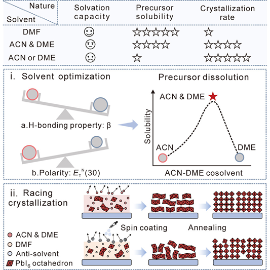 Abstract: The solvation capacity of dispersion solvents plays a crucial role in the solution processing of metal halide perovskites. For instance, N,N-dimethylformamide (DMF), a widely used dispersion solvent, possesses high solvation capacity but often generates suboptimal film quality due to slow crystallization kinetics. We propose using low-solvation binary cosolvents (nitrile- and ether-type solvents) to achieve a balance between solvation (i.e., sufficient solubility of precursors) and desolvation (i.e., rapid crystallization of films) processes during perovskite synthesis. The polarity and hydrogen-bonding property of these cosolvents synergistically enhance their solvation capacity, facilitating perovskite precursor dissolution. Moreover, the low-solvation cosolvents accelerate the crystallization of well-defined intermediate films, yielding higher-quality perovskites than those synthesized with DMF. The optimized modules achieved an active-area efficiency of 22.27%, with a certified aperture-area efficiency of 16.10% and corresponding active-area efficiency of 20.75%. This research on solvation regulation provides universal guidelines for innovatively preparing high-quality halide perovskites.