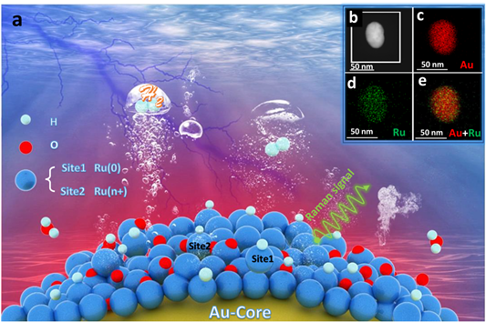 Abstract: Ruthenium exhibits comparable or even better alkaline hydrogen evolution reaction activity than platinum, however, the mechanistic aspects are yet to be settled, which are elucidated by combining in situ Raman spectroscopy and theoretical calculations herein. We simultaneously capture dynamic spectral evidence of Ru surfaces, interfacial water, *H and *OH intermediates. Ru surfaces exist in different valence states in the reaction potential range, dissociating interfacial water differently and generating two distinct *H, resulting in different activities. The local cation tuning effect of hydrated Na+ ion water and the large work function of high-valence Ru(n+) surfaces promote interfacial water dissociation. Moreover, compared to low-valence Ru(0) surfaces, high-valence Ru(n+) surfaces have more moderate adsorption energies for interfacial water, *H, and *OH. They, therefore, facilitate the activity. Our findings demonstrate the regulation of valence state on interfacial water, intermediates, and finally the catalytic activity, which provide guidelines for the rational design of high-efficiency catalysts.