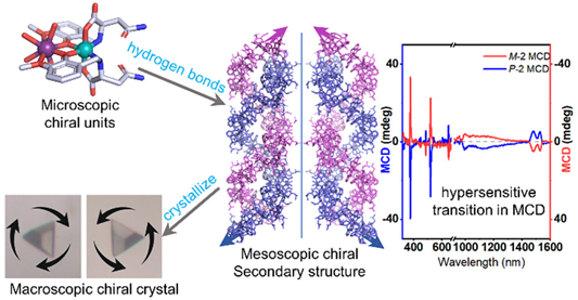 Abstract: Single crystals with chiral shapes aroused the interest of chemists due to their fascinating polarization rotation properties. Although the formation of large-scale spiral structures is considered to be a potential factor in chiral crystals, the precise mechanism behind their formation remains elusive. Herein, we present a rare phenomenon involving the multitransfer and expression of chirality at micro-, meso-, and macroscopic levels, starting from chiral carbon atoms and extending to the double-helical secondary structure, ultimately resulting in the chiral geometry of crystals. The assembly of the chiral double helices is facilitated by the dual characteristics of amide groups derived from amino acids, which serve as both hydrogen bond donors and receptors, similar to the assembly pattern observed in DNA. Crystal face analysis and theoretical morphology reveal two critical factors for the mechanism of the chiral crystal: inherent intrinsically symmetrical distribution of crystal faces and their acquired growth. Importantly, the magnetic circular dichroism (MCD) study reveals the strong magneto-optical response of the hypersensitive f–f transition in the UV–vis–NIR region, which is much stronger than previously observed signals. Remarkably, an external magnetic field can reverse the CD signal. This research highlights the potential of lanthanide-based chiral helical structures as promising magneto-optical materials.