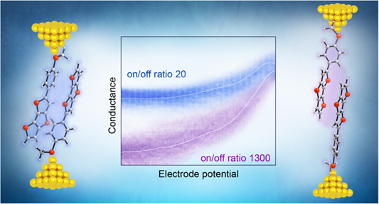 Abstract: The charge transport through supramolecular junctions exhibits unique quantum interference (QI) effects, which provide an opportunity for the design of supramolecular transistors. Benefiting from the configuration dependence of QI, configuration control of the supramolecular assemblies to demonstrate the QI features is a key but challenging step. In this work, we fabricated the supramolecular transistors and investigated the charge transport through the conducting channel of the individual π-stacked thiophene/phenylene co-oligomers (TPCOs) using the electrochemically gated scanning tunneling microscope break junction technique. We controlled the configuration of the supramolecular channel and switched the QI features between the anti-resonance and resonance states of the supramolecular channels. We observed the supramolecular transistor with its on/off ratio above 103 (∼1300), a high gating efficiency of ∼165 mV/dec, a low off-state leakage current of ∼30 pA, and the channel length scaled down to <2.0 nm. Density functional theory calculations suggested that the QI features in π-stacked TPCOs vary depending on the supramolecular architecture and can be manipulated efficiently by fine-tuning the supramolecular configurations. This work reveals the potential of the supramolecular channels for molecular electronics and provides a fundamental understanding of intermolecular charge transport.