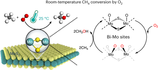 Abstract: Conversion of methane to value-added chemicals at low temperature by directly using inexpensive O2 as oxidant offers an ideal route for methane utilization but remains a great challenge due to the chemical inertness of methane and the low activity of O2. Methane monooxygenase is the only known natural catalyst that can convert methane with O2 at room temperature. Here we report the realization of an artificial process for the direct methane conversion to C1 oxygenates with O2 on an edge-rich MoS2 catalyst at 25 °C, which delivers a remarkable methane conversion of 4.2% with >99% selectivity for C1 oxygenates. In situ spectroscopic and microscopic characterizations and theoretical calculations reveal that the binuclear molybdenum sites of sulfur vacancies at the MoS2 edge can directly dissociate O2 to form O=Mo=O* active species, which can activate the C–H bond and enable methane conversion at room temperature.