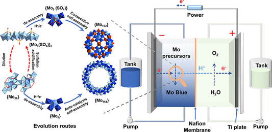 Abstract: The assembly of single-core molybdate into hundreds of cores of giant molybdenum blue (Mo-blue) clusters has remained a long-standing unresolved scientific puzzle. To reveal this fascinating self-assembly behavior, we demonstrate an aqueous flowing in-operando Raman characterization system to capture the building blocks’ evolution from the “black box” reaction process. We successfully visualized the sequential transformation of Na2MoO4 into Mo7O246– ({Mo7}), high nuclear Mo36O1128– ({Mo36}) cluster, and finally polymerization product of [H6K2Mo3O12(SO4)]n ({Mo3(SO4)}n) during the H2SO4 acidification. Notably, the facile conversion of {Mo3(SO4)}n back to the {Mo36} cluster by simple dilution is also discovered. Furthermore, we identified {Mo36} and {Mo3(SO4)}n as exclusive precursors responsible for driving the electrochemical self-assembly of {Mo154} and {Mo102}, respectively. The study also unravels a pivotal intermediate, the pentagonal reduced state fragment [H18MoVI4MoVO24]−, originating from {Mo36}, which catalyzes the autocatalytic self-assembly of {Mo154} with electron and proton injection during electrochemical processes. Concurrently, {Mo3(SO4)}n serves as the indispensable precursor for {Mo102} formation, generating sulfation pentagon building blocks of [H2Na2O2(H4MoVMoVI4O16SO4)4]4– that facilitate the consecutive assembly of giant {Mo102} sphere clusters. As a result, a complete elucidation of the assembly pathway of giant Mo-blue clusters derived from single-core molybdate was obtained, and H+/e– redox couple is revealed to play a critical role in catalyzing the deassembly of the precursor, leading to the formation of thermodynamically stable intermediates essential for further self-assembly of reduced state giant clusters.