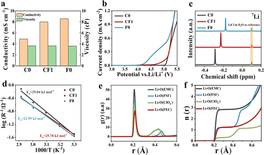 Abstract: High-voltage lithium metal batteries (HV-LMBs) comprising Ni-rich cathodes (such as LiNi0.8Mn0.1Co0.1O2) and a lithium metal anode (LMA) are highly promising with an energy density of 500 Wh kg−1. However, the stability of the electrode/electrolyte interface of HV-LMBs presents significant challenges. In addition, LMAs have several limitations, such as dendrite growth, production of dead-Li0, and repeated collapse and reconstruction of the SEI layer. Ni-rich cathode materials suffer from rapid capacity decline and structural collapse. Herein, we report an electrolyte with a bianionic coordination solvation structure (CF1) with a high voltage window and significantly enhanced stability at the electrode/electrolyte interface. Raman spectra and molecular dynamics (MD) simulations confirmed the unique solvation structure of CF1. XPS and cryo-TEM indicate that a unique heterogeneous phase SEI of LiF-rich crystals is formed in the CF1 electrolyte, which facilitates the uniform and dense deposition of Li while inhibiting the growth of lithium dendrites. Moreover, the CF1 electrolyte has a high ionic conductivity (7.84 mS cm−1), which is favorable for rapid Li+migration. An Li||Cu cell using the CF1 electrolyte achieved an average coulombic efficiency (CE) of 99.6%. Meanwhile, the Li||Li symmetric cell exhibits stable cycling for 1200 h (1.0 mA cm−2, 0.5 mAh cm−2). Furthermore, the Li||NCM811 full cell with the CF1 electrolyte was stable for 270 cycles, with 81% capacity retention at a cut-off voltage of 4.5 V (N/P = 2.5, 0.5 C). Our study presents a new approach for designing electrolytes for HV-LMBs, aimed at streamlining their practical implementation.