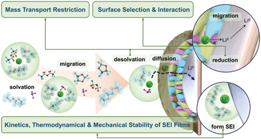 Abstract: Lithium (Li) metal has emerged as a viable alternative anode material to address the current energy density shortfalls in Li batteries. However, its integration into widespread implementation remains somewhat constrained due to the substandard reversibility issues and safety concerns arising from erratic Li deposition. To effectively tackle these obstacles, considerable endeavors have been exerted to modulate the morphology of Li deposition. Nevertheless, it is exceedingly challenging for Li nuclei that tend to dendritic growth thermodynamically to transform into dense Li morphologies during their growth process. Therefore, it is crucial to understand what influences the formation process of Li nuclei and how to improve the state of Li nuclei. Herein, Li nucleation mechanisms involving mass transport across the solid electrolyte interface from electrolyte to electrode and electrode interfacial reactions are elucidated. Inspired by the understanding of Li nucleation, the corresponding design principles, including enhancing and homogenizing mass transport, stabilizing solid electrolyte interface film, and regulating surface interaction/selection, are summarized for optimizing Li nucleation and further inducing dendrite-free Li deposition. In light of the competition among these design principles, a perspective on the existing challenges and opportunities for further promoting the application of Li metal batteries is proposed.
