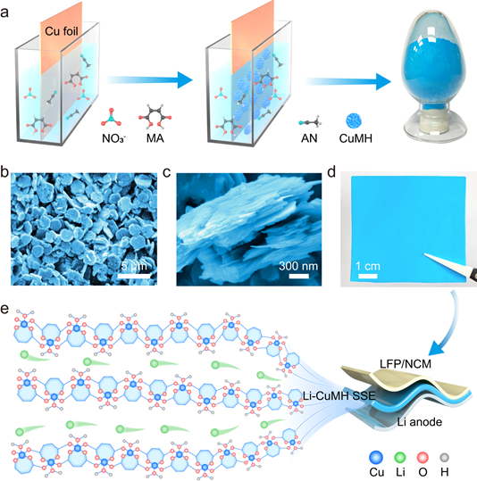Abstract: As the core component of solid-state batteries, neither current inorganic solid-state electrolytes nor solid polymer electrolytes can simultaneously possess satisfactory ionic conductivity, electrode compatibility and processability. By incorporating efficient Li+ diffusion channels found in inorganic solid-state electrolytes and polar functional groups present in solid polymer electrolytes, it is conceivable to design inorganic-organic hybrid solid-state electrolytes to achieve true fusion and synergy in performance. Herein, we demonstrate that traditional metal coordination compounds can serve as exceptional Li+ ion conductors at room temperature through rational structural design. Specifically, we synthesize copper maleate hydrate nanoflakes via bottom-up self-assembly featuring highly-ordered 1D channels that are interconnected by Cu2+/Cu+ nodes and maleic acid ligands, alongside rich COO− groups and structural water within the channels. Benefiting from the combination of ion-hopping and coupling-dissociation mechanisms, Li+ ions can preferably transport through these channels rapidly. Thus, the Li+-implanted copper maleate hydrate solid-state electrolytes shows remarkable ionic conductivity (1.17 × 10−4 S cm−1 at room temperature), high Li+ transference number (0.77), and a 4.7 V-wide operating window. More impressively, Li+-implanted copper maleate hydrate solid-state electrolytes are demonstrated to have exceptional compatibility with both cathode and Li anode, enabling long-term stability of more than 800 cycles. This work brings new insight on exploring superior room-temperature ionic conductors based on metal coordination compounds.