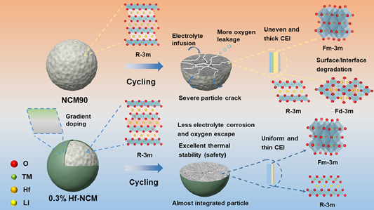 Title: Precise modulation of surface lattice to reinforce structural stability of high-nickel layered oxide cathode by hafnium gradient doping
