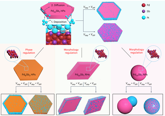 Abstract: Constructing regioselective architectures in heterostructures is important for many applications; however, the targeted design of regioselective architectures is challenging due to the sophisticated processes, impurity pollution and an unclear growth mechanism. Here we successfully realized a one-pot kinetically controlled synthetic framework for constructing regioselective architectures in metallic heterostructures. The key objective was to simultaneously consider the reduction rates of metal precursors and the lattice matching relationship at heterogeneous interfaces. More importantly, this synthetic method also provided phase- and morphology-independent behaviours as foundations for choosing substrate materials, including phase regulation from Pd20Sb7 hexagonal nanoplates (HPs) to Pd8Sb3 HPs, and morphology regulation from Pd20Sb7 HPs to Pd20Sb7 rhombohedra and Pd20Sb7 nanoparticles. Consequently, the activity of regioselective epitaxially grown Pt on Pd20Sb7 HPs was greatly enhanced towards the ethanol oxidation reaction; its activity was 57 times greater than that of commercial Pt/C, and the catalyst showed increased stability (decreasing by 16.3% after 2,000 cycles) and selectivity (72.4%) compared with those of commercial Pt/C (56.0%, 18.2%). This work paves the way for the design of unconventional well-defined heterostructures for use in various applications.