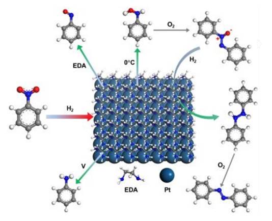 Abstract: A full selectivity control over the catalytic hydrogenation of nitroaromatics leads to the production of six possible products, i.e., nitroso, hydroxylamine, azoxy, azo, hydrazo or aniline compounds, which has however not been achieved in the field of heterogeneous catalysis. Currently, there is no sufficient evidence to support that the catalytic hydrogenation of nitroaromatics with the use of heterogeneous metal catalysts would follow the Haber's mechanistic scheme based on electrochemical reduction. We now demonstrate in this work that it is possible to fully control the catalytic hydrogenation of nitroaromatics into their all six products using a single catalytic system under various conditions. Employing SnO2-supported Pt nanoparticles facilitated by the surface coordination of ethylenediamine and vanadium species enabled this unprecedented selectivity control. Through systematic investigation into the controlled production of all products and their chemical reactivities, we have constructed a detailed reaction network for the catalytic hydrogenation of nitroaromatics. Crucially, the application of oxygen-isolated characterization techniques proved indispensable in identifying unstable compounds such as nitroso, hydroxylamine, hydrazo compounds. The insights gained from this research offer invaluable guidance for selectively transforming nitroaromatics into a wide array of functional N-containing compounds, both advancing fundamental understanding and fostering practical applications in various fields.