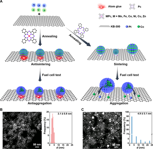 Abstract: Pt-based nanoparticles (NPs) have been widely used in catalysis. However, this suffers from aggregation and/or sintering at working conditions. We demonstrate a robust strategy for stabilizing PtCo NPs under high temperature with strong interaction between M–N–C and PtCo NPs with Pt–M–N coordination, namely, “atom glue.” Such atom glue for stabilizing Pt-based NPs can be extended to Zn, Mn, Fe, Ni, Co, and Cu, being a versatile strategy for stabilizing PtCo NPs, which substantially promotes the performance toward oxygen reduction reaction (ORR) and fuel cell. Impressively, the mass activity (MA) reaches 2.99 A mgPt−1 for ORR over g-Zn–N–C/PtCo, and 79.3% of the initial MA is maintained after 90K cycles in fuel cell. This work provides a versatile strategy for stabilizing Pt-based NPs via atom glue, which is likely to spark widespread interest across various fields.