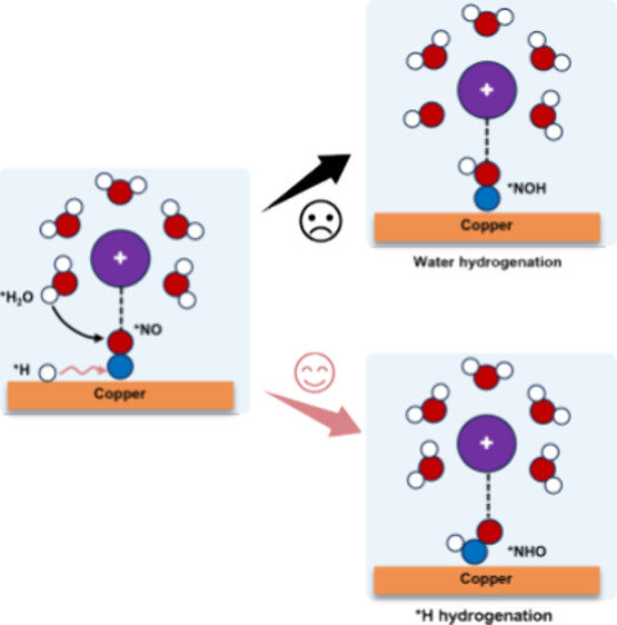 Abstract: The electrochemical nitrate reduction reaction (NO3RR) offers a promising solution for remediating nitrate-polluted wastewater while enabling the sustainable production of ammonia. The control strategy of surface-active hydrogen (*H) is extensively employed to enhance the kinetics of the NO3RR, but atomic understanding lags far behind the experimental observations. Here, we decipher the cation-water-adsorbate interactions in regulating the NO3RR kinetics at the Cu (111) electrode/electrolyte interface using AIMD simulations with a slow-growth approach. We demonstrate that the key oxygen-containing intermediates of the NO3RR (e.g., *NO, *NO2, and *NO3) will stably coordinate with the cations, impeding their integration with the hydrogen bond network and further their hydrogenation by interfacial water molecules due to steric hindrance. The *H can migrate across the interface with a low energy barrier, and its hydrogenation barrier with oxygen-containing species remains unaffected by cations, offering a potent supplement to the hydrogenation process, playing the predominant factor by which the *H facilitates NO3RR reaction kinetic. This study provides valuable insights for understanding the reaction mechanism of NO3RR by fully considering the cation–water–adsorbate interactions, which can aid in the further development of the electrolyte and electrocatalysts for efficient NO3RR.